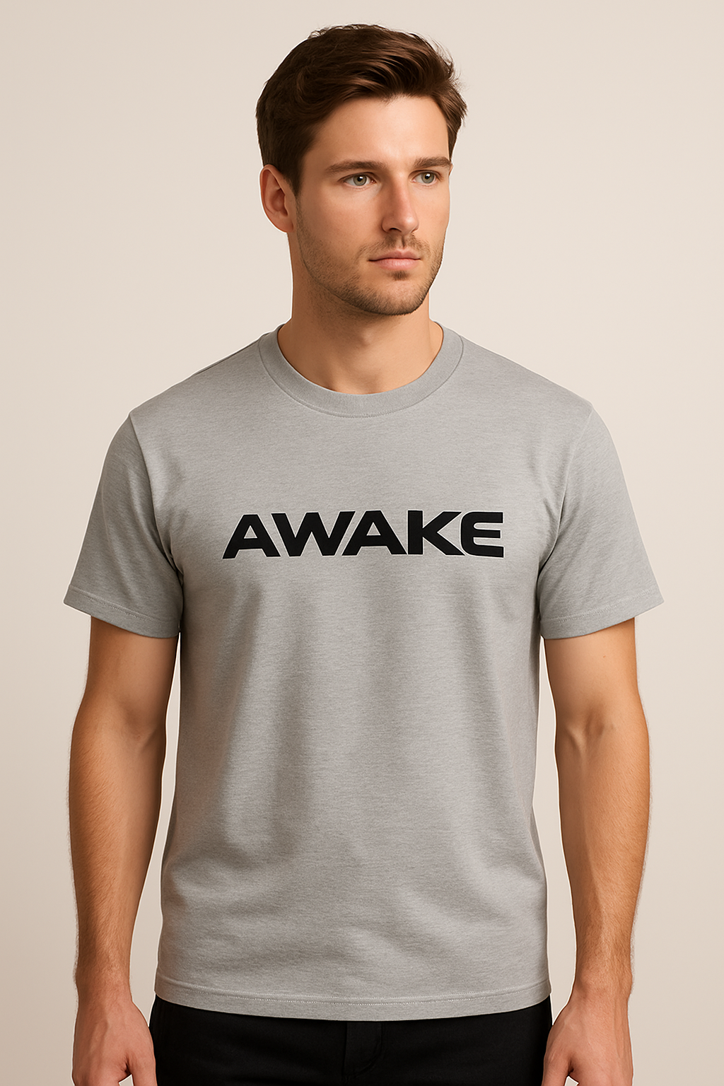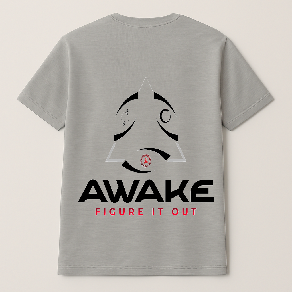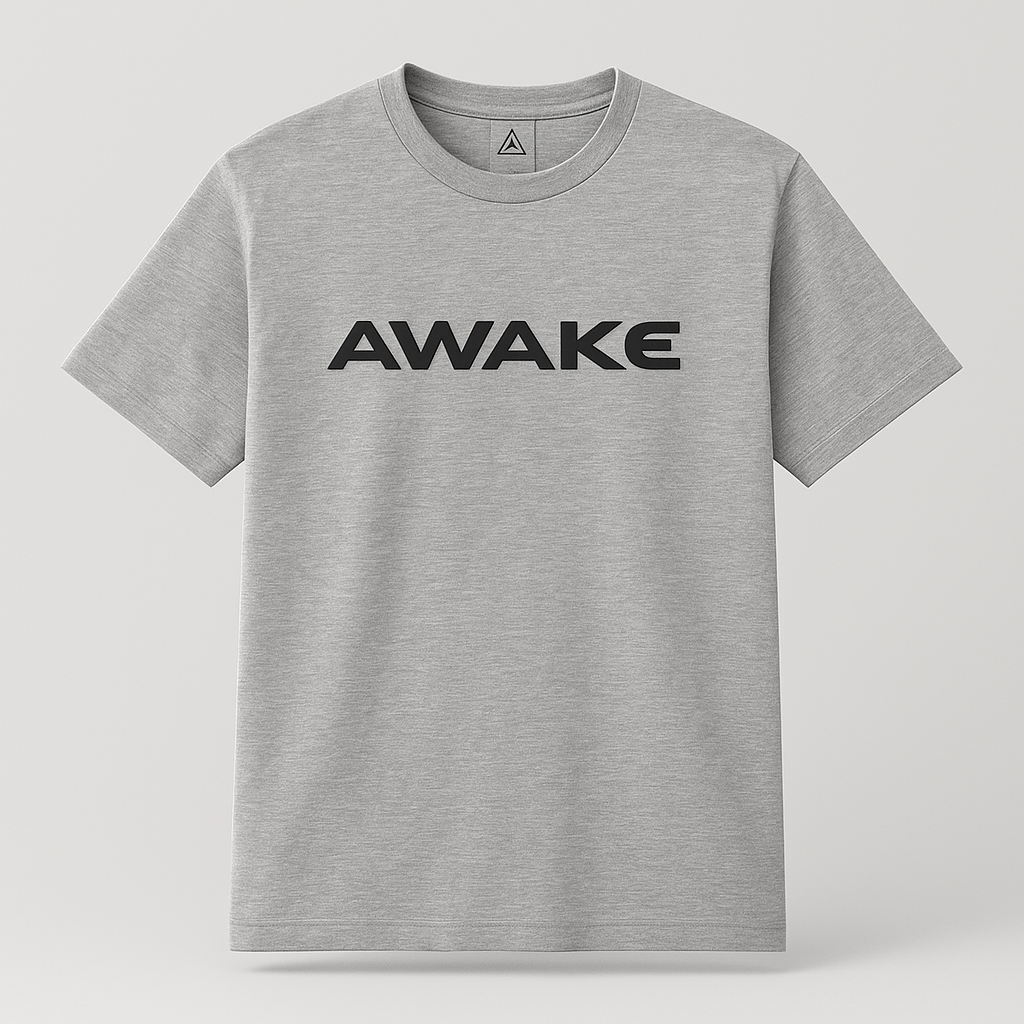 The stone gray shirt features a clean front with bold AWAKE lettering — clear, direct, intentional.